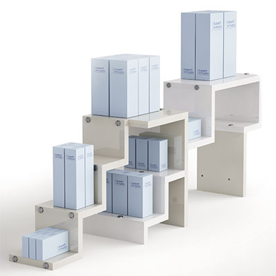 Un espositore a gradini sicuramente non convenzionale, lo Scale Easy proposto nella composizione Modello Cosmo, con gli elementi posizionati in modo preordinato, oppure ancor più personalizzabile nelle dimensioni, su richiesta. Il sistema modulare Cosmo costituisce un meccanismo espositivo molto originale, che riesce a mettere in evidenza i prodotti esposti grazie alla sinuosità delle sue linee.
